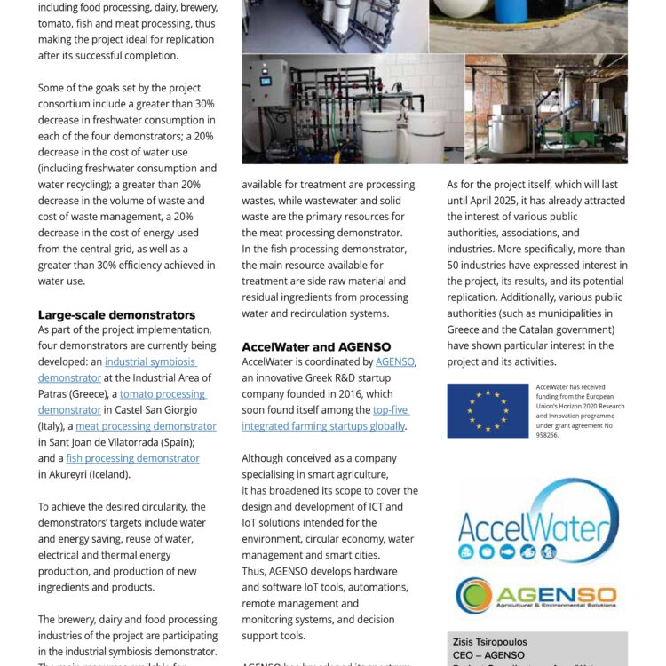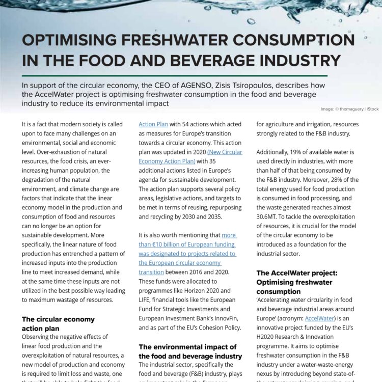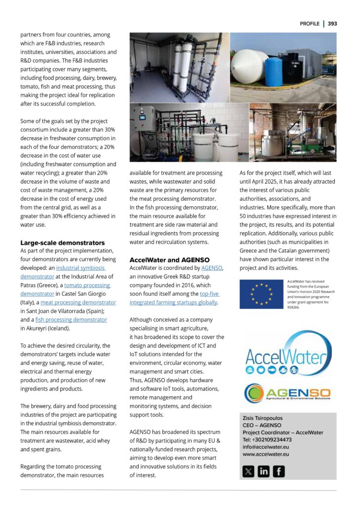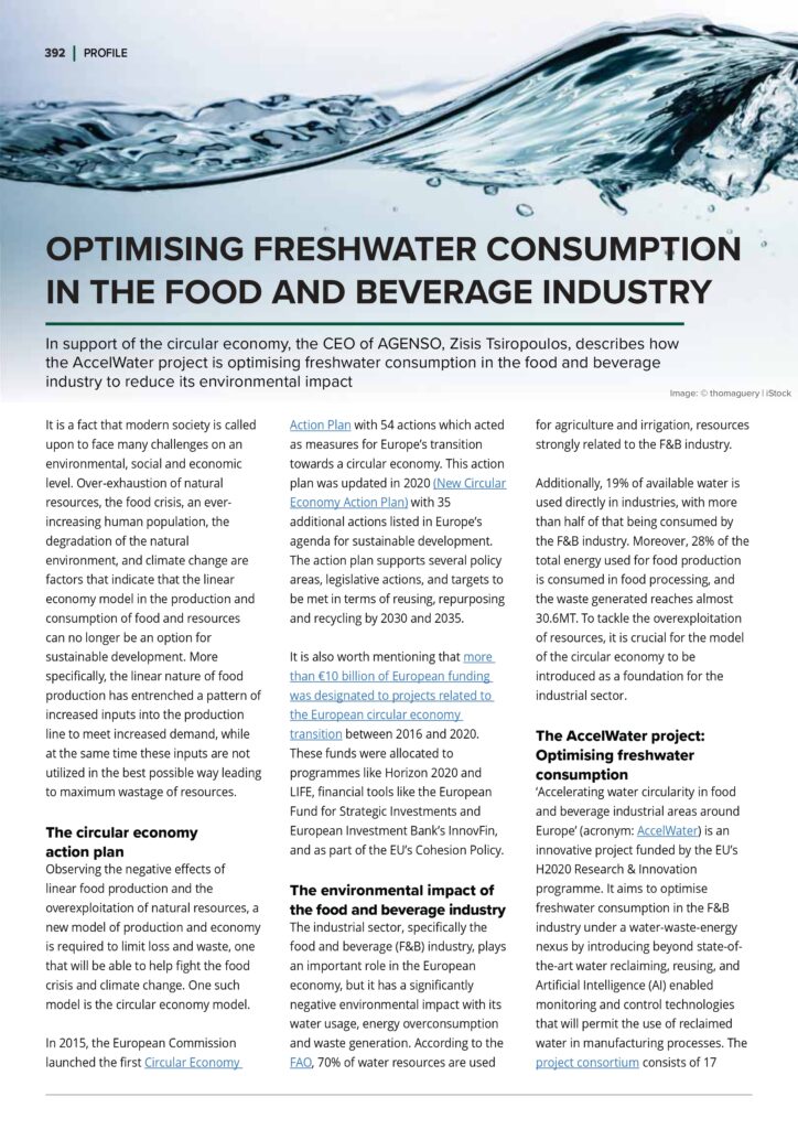 Just recently, a profile piece for AccelWater that we wrote for the Open Acces Government October 2023 issue was published. The profile can be found in pages 392-393, under the “Environment” section and describes how the AccelWater project is optimising freshwater consumption in the food and beverage industry to reduce its environmental impact.
