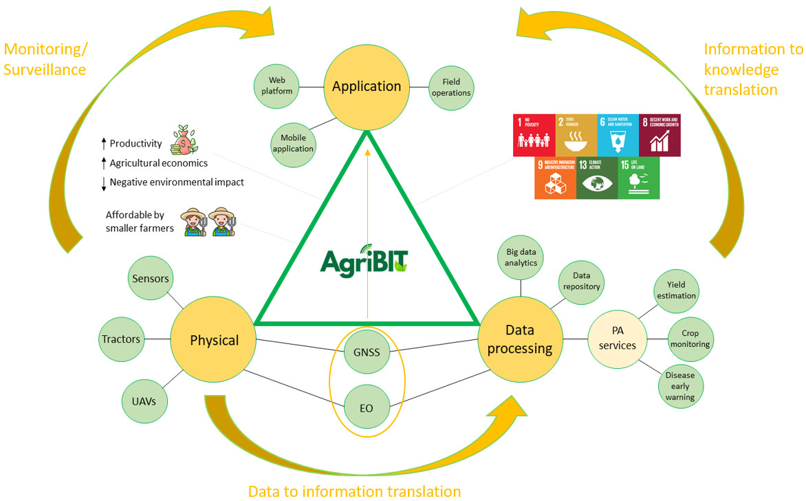 The goal of AgriBIT is to improve the agriculture chain by delivering higher precision, more accurate and continuously available Precision Agriculture services, combining GNSS, and more specifically new high precision Galileo positioning and augmentation services like EGNOS, Earth Observation (EO) information with on-field and on-machine sensors and actuators, Artificial Intelligence (AI) technologies and expert agricultural knowledge.